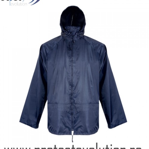 Scurta de ploaie cu gluga ascunsa in guler. Inchidere cu fermoar;