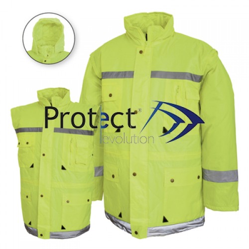 CONSTRUCTIE: scurta impermeabila de iarna din material peliculizat, cu benzi reflectorizante, guler inalt cu gluga detasabila inclusa, inchidere cu fermoar acoperit cu fenta, buzunare multifunctionale acoperite cu clapete si inchise cu capse, maneci detasabile, drepte terminate cu tiv, aplicate la haina cu fermoare.